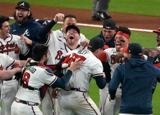 Los Bravos de Atlanta celebran el título de la Serie Mundial del béisbol de las Grandes Ligas, obtenido este martes en el sexto juego (4-2), al derrotar…