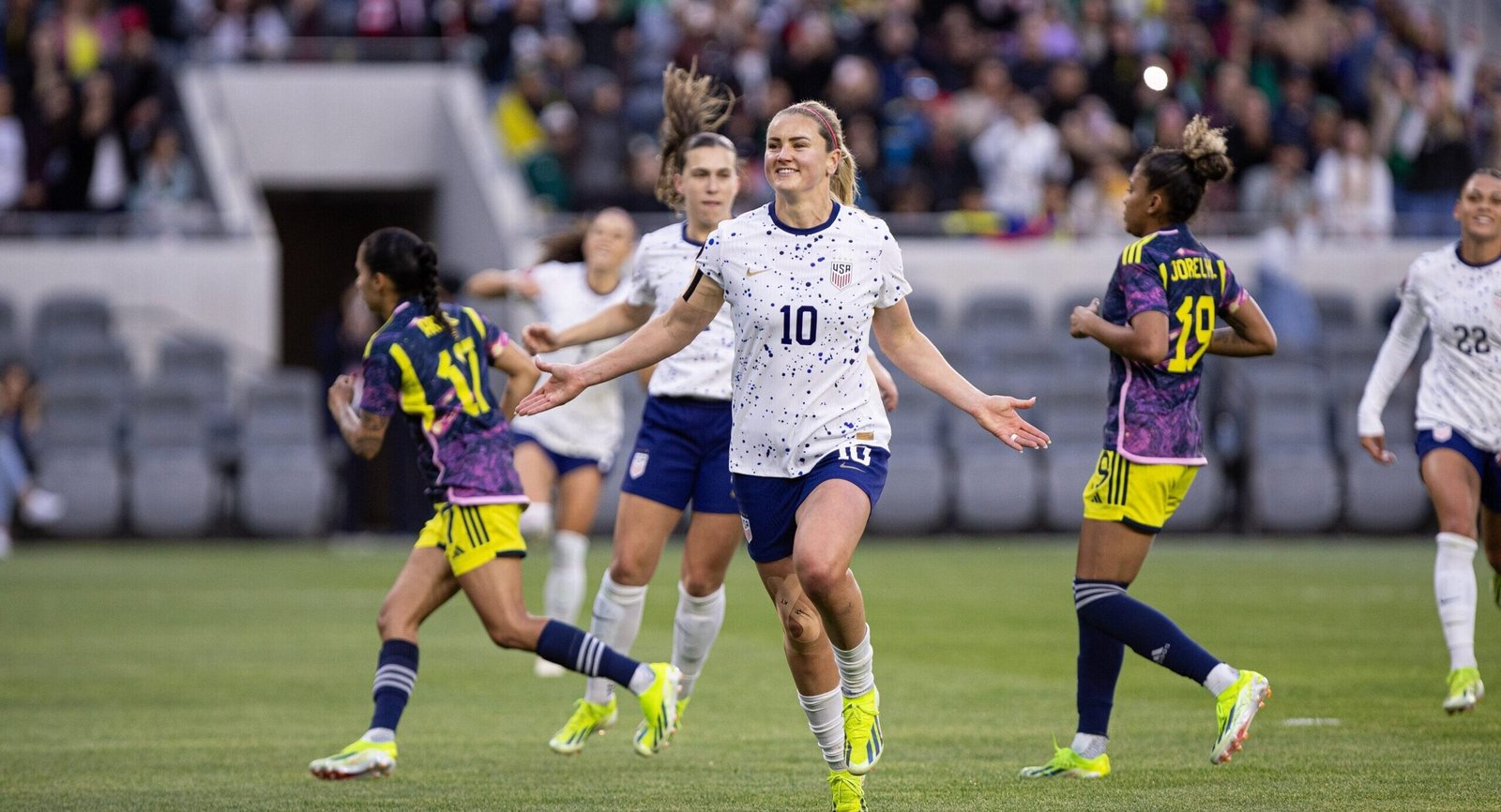 En el primer tanto, una mala entrega terminó con un ataque de Estados Unidos y un penal por parte de Jorelyn Carabali, quien tumbó a Alex Morgan dentro del área. Lindsey Horan se encargó del cobro para el 1-0 del partido.