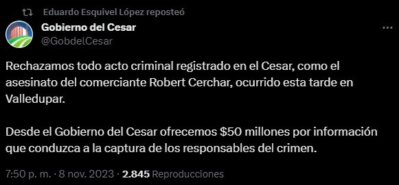 Rechazamos todo acto criminal registrado en el Cesar, como el asesinato del comerciante Robert Cerchar, ocurrido esta tarde en Valledupar. Desde el Gobierno del Cesar ofrecemos $50 millones por información que conduzca a la captura de los responsables del crimen”, dijo Esquivel.