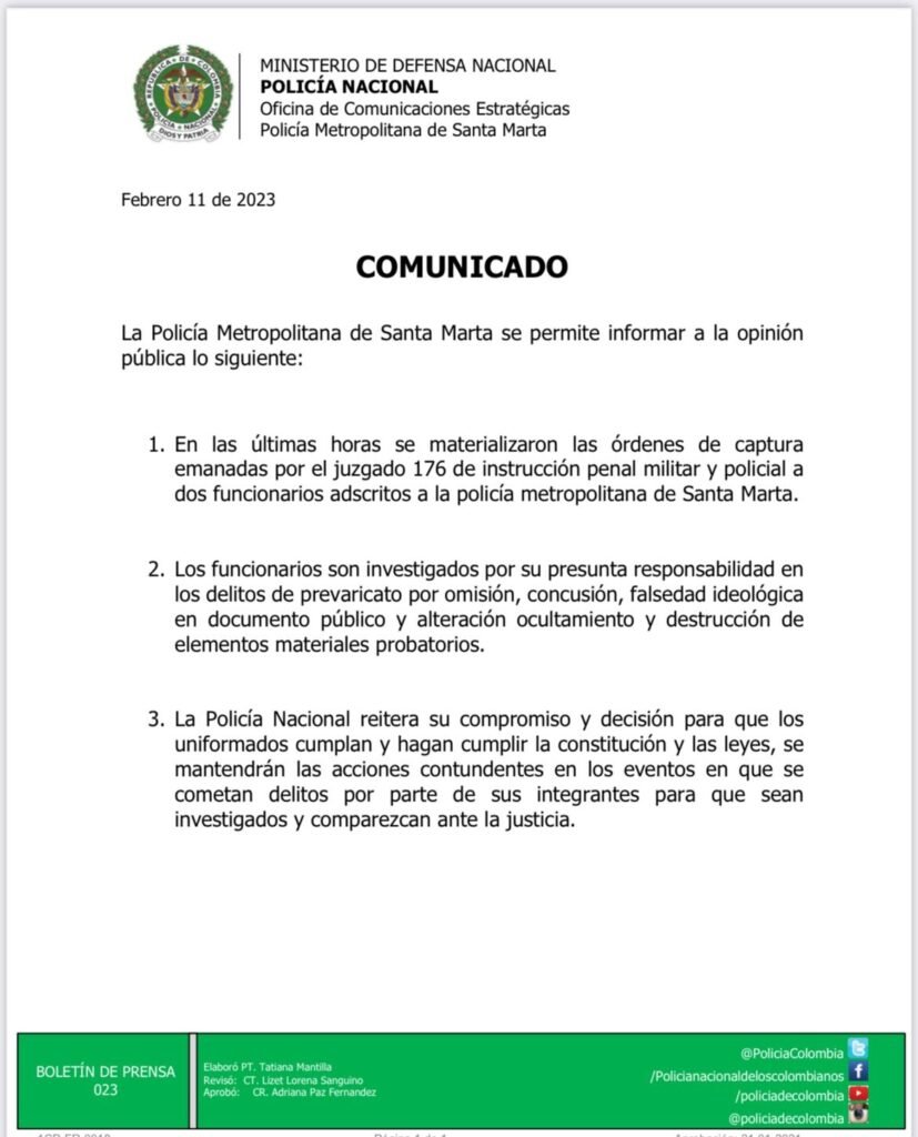 Las capturas se hicieron efectivas en el comando de la Policía Metropolitana de Santa Marta en la noche del 11 de febrero. A los uniformados se los sindicó con los delitos de concusión, falsedad ideológica en documento público, prevaricato por omisión, ocultamiento y alteración o destrucción de elemento material probatorio.