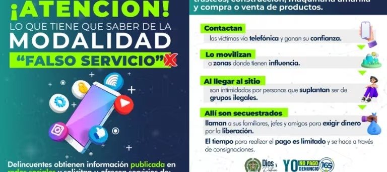 Según dio a conocer el Gaula de la Policía Nacional a través de redes sociales, los extorsionistas están implementando el falso Servicio. Dicha modalidad, de la que las autoridades tuvieron conocimiento gracias a denuncias de quienes se han visto afectados, estaría basada en la recolección de información en redes sociales por parte de los criminales que, primero, investigan la vida privada de sus víctimas.