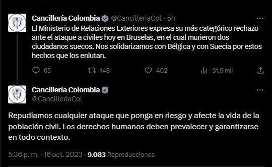 “El Ministerio de Relaciones Exteriores expresa su más categórico rechazo ante el ataque a civiles hoy en Bruselas, en el cual murieron dos ciudadanos suecos. Nos solidarizamos con Bélgica y con Suecia por estos hechos que los enlutan”, publicó el Ministerio de Relaciones Exteriores, cuyo titular, Álvaro Leyva, está en el “ojo del huracán” por sus más recientes apariciones.