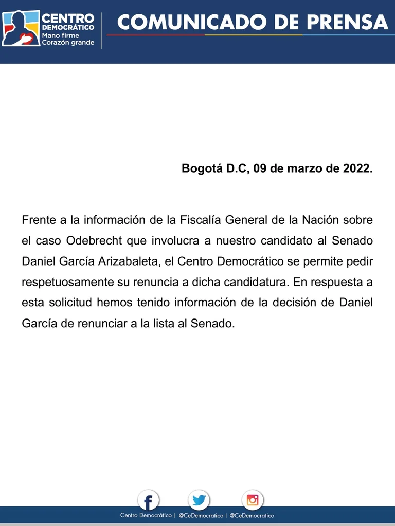 Frente a la información de la Fiscalía General de la Nación sobre el caso Odebrecht que involucra a nuestro candidato al Senado Daniel García Arizabaleta, el Centro Democrático se permite pedir respetuosamente su renuncia a dicha candidatura. En respuesta a esta solicitud hemos tenido información de la decisión de Daniel García de renunciar a la lista al Senado.