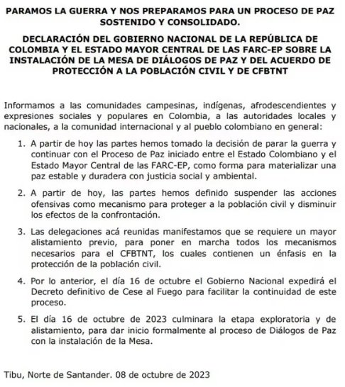 El Gobierno nacional y el Estado Mayor Central (EMC), disidencias de las Farc al mando de alias Iván Mordisco, acordaron el cese al fuego bilateral en todo el país, el cual regirá a partir del 16 de octubre de 2023. Y de las operaciones ofensivas desde la medianoche del domingo 8 de octubre, en el que se considera el primer paso entre ambas partes para poner fin al conflicto.