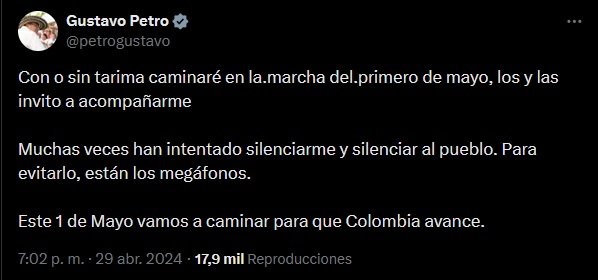 “Con o sin tarima caminaré en la marcha del primero de mayo, los y las invito a acompañarme. Muchas veces han intentado silenciarme y silenciar al pueblo. Para evitarlo, están los megáfonos. Este primero de mayo vamos a caminar para que Colombia avance”, trinó el mandatario en la noche de este lunes. El mensaje fue entendido como una respuesta a esa advertencia de los sindicatos; sin embargo, rápidamente el alcalde de Bogotá, Carlos Fernando Galán, aclaró que no se ha prohibido el uso de la tarima, sino que se presentaron varias solicitudes de sindicatos diferentes.
