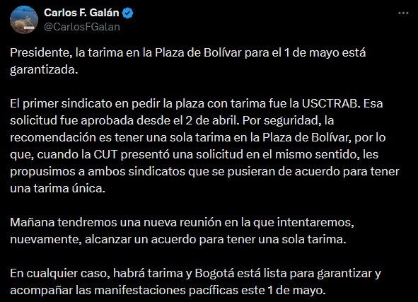“Presidente, la tarima en la Plaza de Bolívar para el 1 de mayo está garantizada. El primer sindicato en pedir la plaza con tarima fue la USCTRAB. Esa solicitud fue aprobada desde el 2 de abril. Por seguridad, la recomendación es tener una sola tarima en la Plaza de Bolívar, por lo que, cuando la CUT presentó una solicitud en el mismo sentido, les propusimos a ambos sindicatos que se pusieran de acuerdo para tener una tarima única”, dijo Galán.