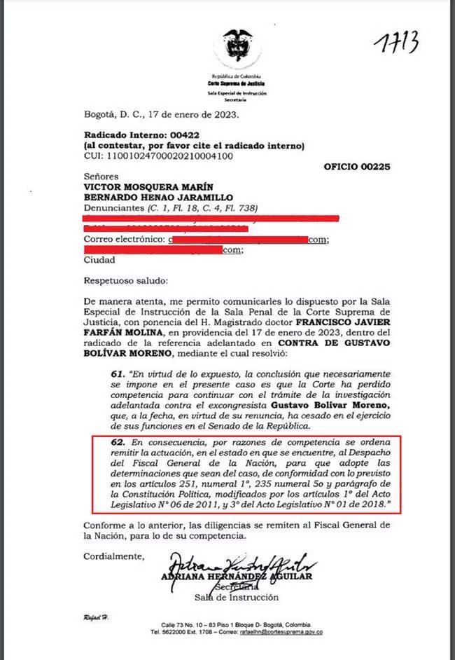 La Corte Suprema de Justicia anunció, en la mañana de este miércoles 18 de enero, que se declaraba impedida para seguir investigando al exsenador Gustavo Bolívar, del Pacto Histórico, por la presunta financiación a la Primera Línea en el marco del Paro Nacional del 2021. El caso pasará a la justicia ordinaria a cargo de la Fiscalía General de la Nación, dado que el escritor ya no ostenta su curul en el Senado de la República.