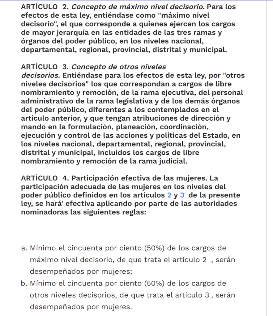 La Ley 581 de 2000 establece que la participación efectiva de las mujeres en cargos de máximo nivel decisorio y de otros niveles decisorios debe ser del 50% – crédito Función Pública