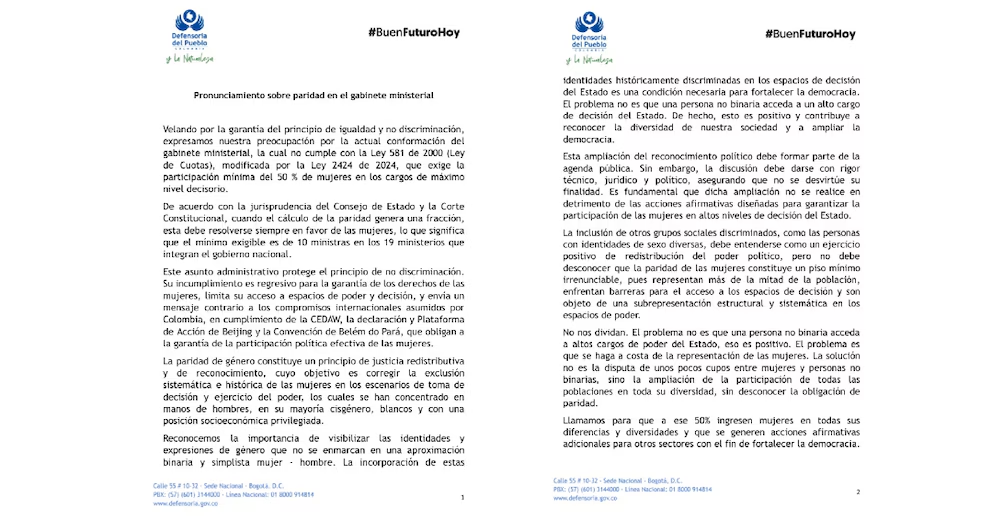 La Defensoría del Pueblo, a cargo de Iris Marín, se sumó al debate por medio de un comunicado en que el que advirtió sobre el incumplimiento de la paridad de género en la composición del gabinete ministerial actual, señalando que la participación de mujeres no alcanza el mínimo legal establecido en la normativa vigente. De acuerdo con el pronunciamiento difundido por la entidad, la integración del gabinete no cumple con la Ley 581 de 2000, modificada por la Ley 2424 de 2024.