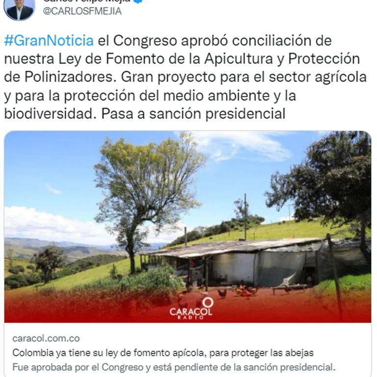 El senador Carlos Felipe Mejía, creador del proyecto, aseguró, en Caracol Radio, que esta es la primera vez que se fijo en Colombia un política pública de este tipo. Detalló que las especies polinizadoras son fundamentales para la preservación de la biodiversidad y la reproducción de las especies vegetales.