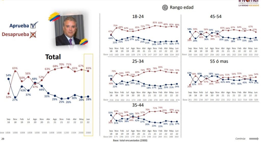 A dos meses del fin de su gobierno, todo parece indicar que el presidente Iván Duque terminará su mandato con uno de los niveles más altos de desfavorabilidad de gestión para un mandatario. Según la encuesta Invamer Colombia Opina #13, para el mes de junio, el hoy jefe de Estado registra un rechazo del 65% a la manera como está desempeñando su labor, frente a una favorabilidad del 28%. Sin embargo, al hacer la comparación con los resultados del estudio de comienzos de mayo, se puede ver que Duque recupera dos puntos (la desfavorabilidad estaba entonces en 67%), mientras que la opinión a favor de mantiene estable (28%).