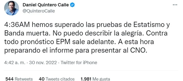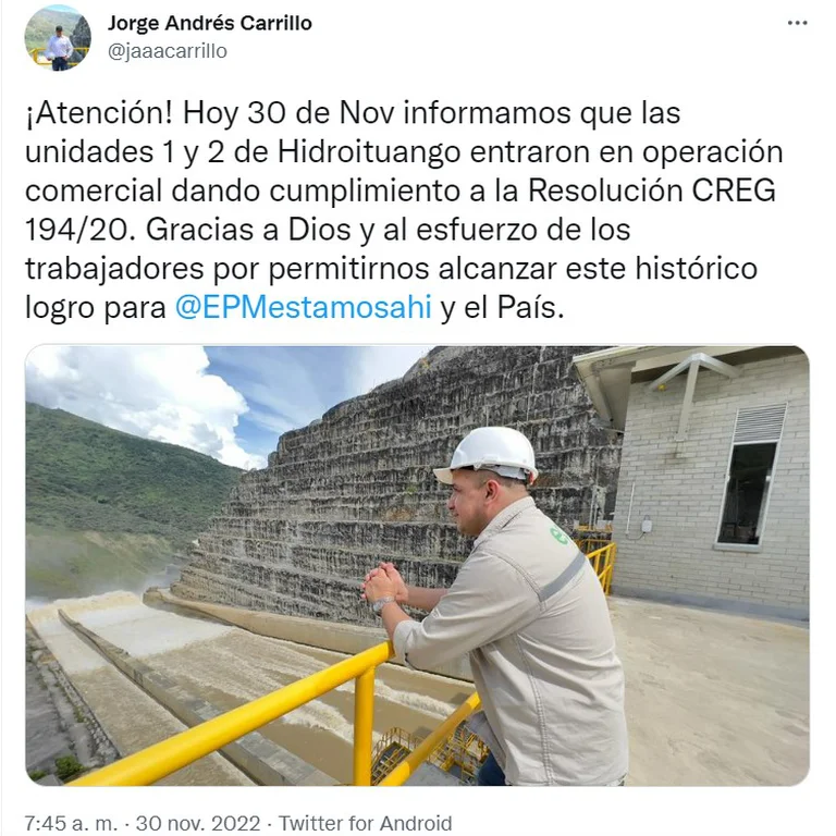 “Hace unos minutos finalizaron satisfactoriamente las pruebas de estatismo y banda muerta de la unidad 2 de Hidroituango. Tenemos un equipo de héroes soportados en la mejor organización del mundo! Gracias a todos”, indicó el gerente de EPM.