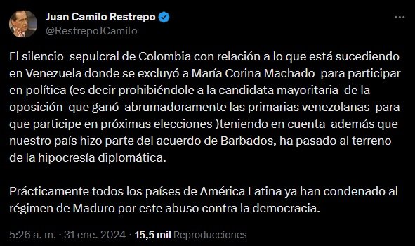 El senador del partido Verde Oxígeno mencionó que “Colombia es dueño de su silencio, pero cuando el silencio es estruendoso, al menos deberían explicarnos cuál es su fundamento y qué propósito se busca”. Sobre ese tema también se pronunció el exsenador conservador Juan Camilo Restrepo, quien calificó como una “hipocresía diplomática” la falta de posición política de Colombia. “Prácticamente ya todos los países de América Latina ya han condenado al régimen de Maduro por este abuso contra la democracia”, mencionó.