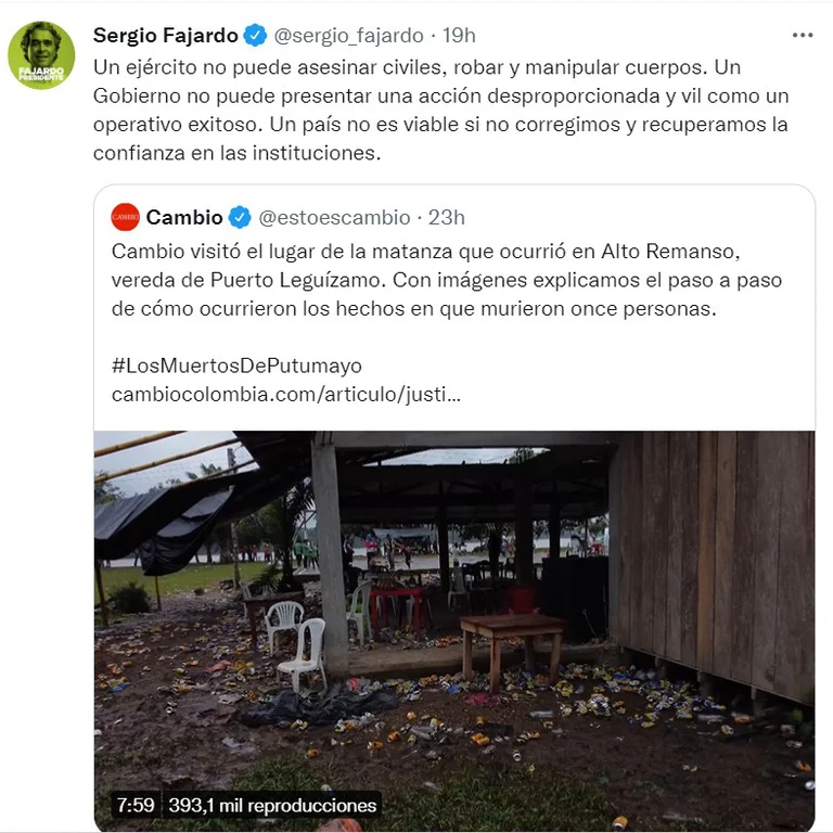 “Un ejército no puede asesinar civiles, robar y manipular cuerpos. Un Gobierno no puede presentar una acción desproporcionada y vil como un operativo exitoso. Un país no es viable si no corregimos y recuperamos la confianza en las instituciones”, señaló Fajardo respecto a los nuevos testimonios conocidos.