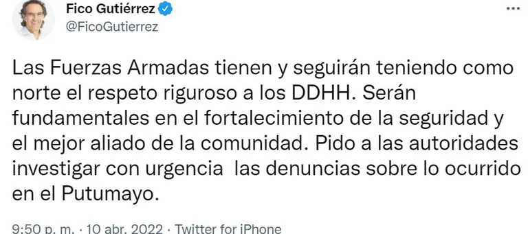 “Las Fuerzas Armadas tienen y seguirán teniendo como norte el respeto riguroso a los DDHH. Serán fundamentales en el fortalecimiento de la seguridad y el mejor aliado de la comunidad. Pido a las autoridades investigar con urgencia las denuncias sobre lo ocurrido en el Putumayo”, aseguró Gutiérrez.