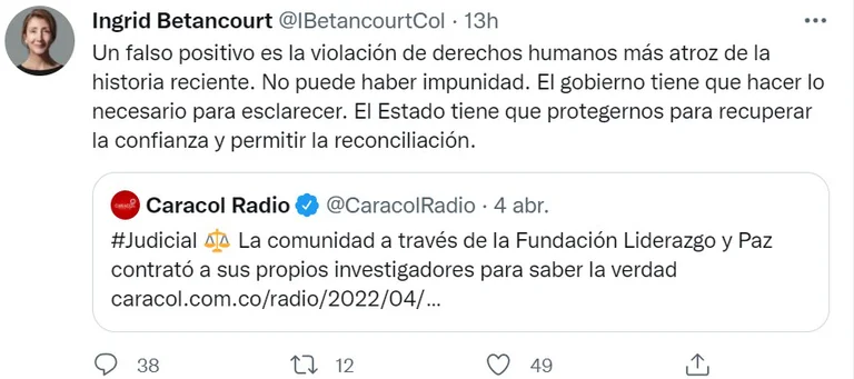 Ingrid Betancourt no dudó en calificar el hecho como un falso positivo y solicitó que haya condenas. “Un falso positivo es la violación de derechos humanos más atroz de la historia reciente. No puede haber impunidad. El gobierno tiene que hacer lo necesario para esclarecer. El Estado tiene que protegernos para recuperar la confianza y permitir la reconciliación”, sostuvo la candidata.