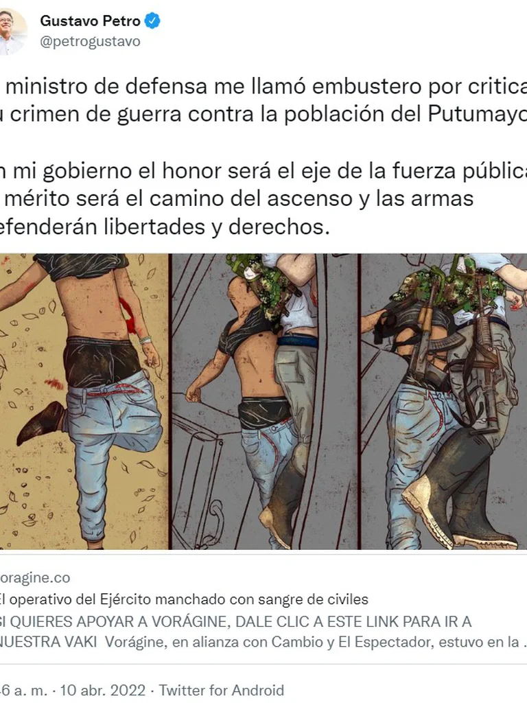 Ahora Petro reiteró sus cuestionamientos: “El ministro de defensa me llamó embustero por criticar su crimen de guerra contra la población del Putumayo. En mi gobierno el honor será el eje de la fuerza pública, el mérito será el camino del ascenso y las armas defenderán libertades y derechos”, sostuvo.