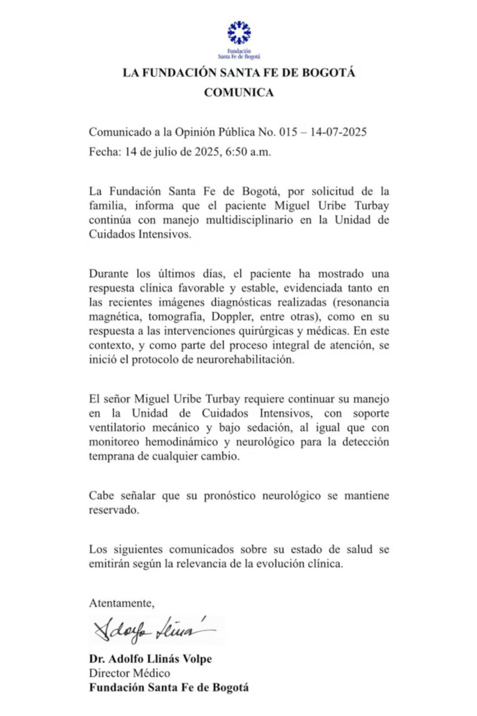 En la mañana del lunes 14 de julio de 2025, la Fundación Santa Fe, de Bogotá, emitió un nuevo comunicado sobre el estado de salud del senador y precandidato presidencial Miguel Uribe Turbay, tras sufrir un ataque sicarial el sábado 7 de junio durante un acto público en el barrio Modelia, occidente de Bogotá.