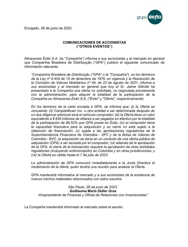 Así lo confirma el comunicado de GPA: “Esto requeriría la aprobación de otras agencias reguladoras (incluyendo antimonopolio) en Colombia y otras jurisdicciones“.