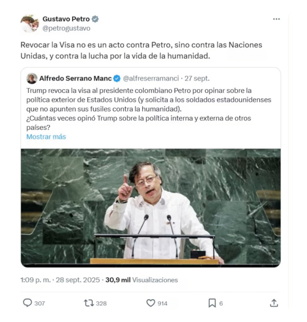 En un nuevo pronunciamiento en sus redes sociales, durante la tarde del domingo 28 de septiembre de 2025, el presidente de la República, Gustavo Petro, se refirió a la decisión del Gobierno de los Estados Unidos: que tras su polémica participación en un evento pro Palestina, el viernes 26 de septiembre en Nueva York, decidió revocarle la visa, por interferir en su soberanía nacional con una serie de llamados.