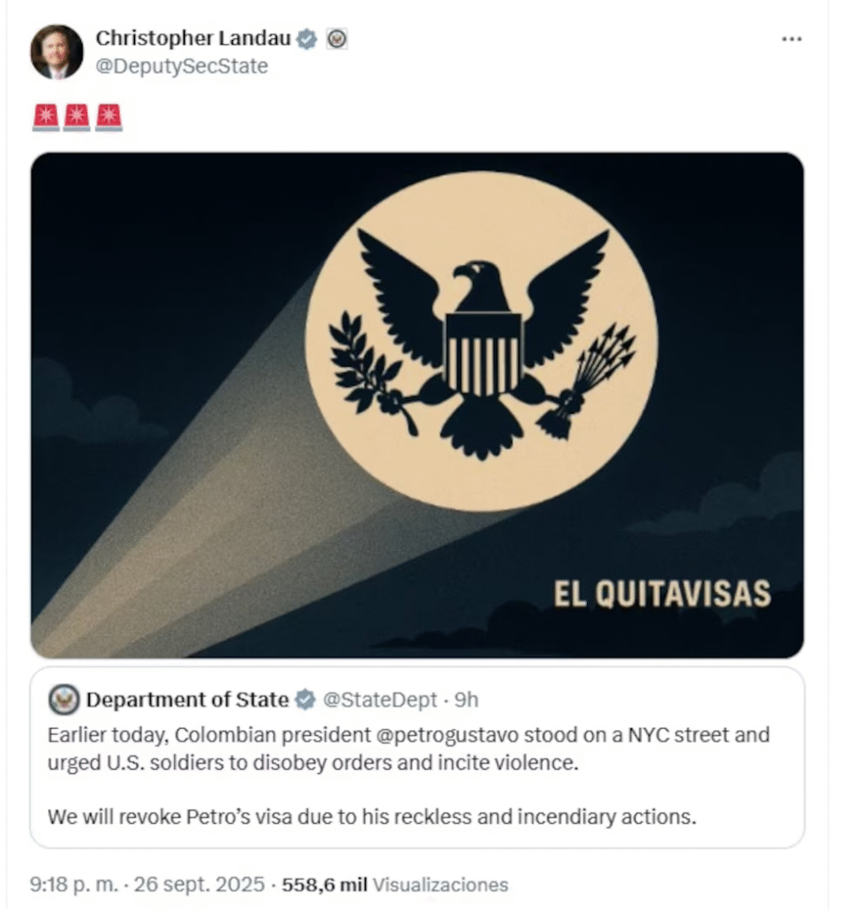 El subsecretario de Estado, Cristopher Landau, también reaccionó a la decisión de su administración de quitarle la visa al presidente Gustavo Petro – crédito @DeputySecState/X