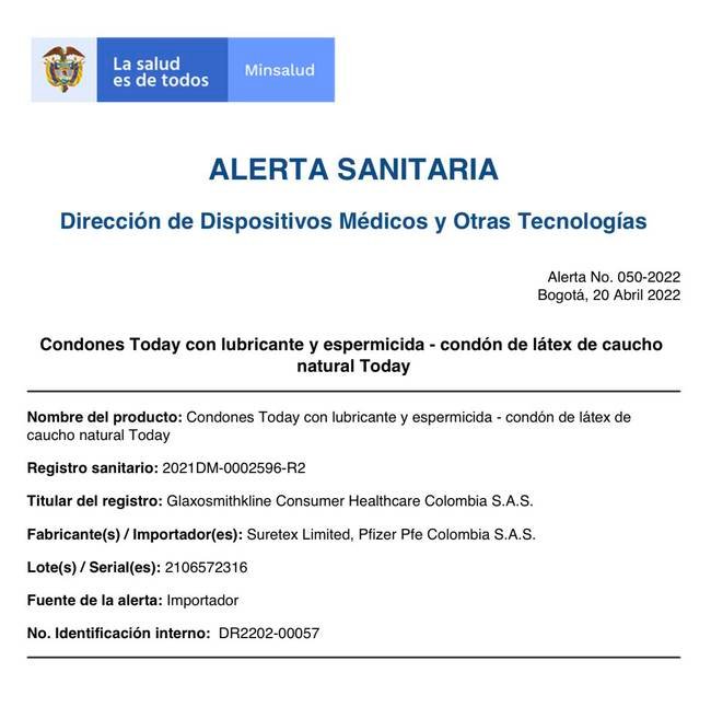 Por esta razón, la entidad sanitaria ordenó retirar de manera inmediata el lote número 2106572316 de condones Today de látex de caucho natural con lubricante y espermicida.