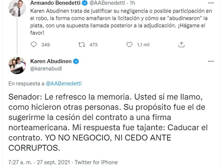 En respuesta, Abudinen le dijo: “Senador: Le refresco la memoria. Usted sí me llamó, como hicieron otras personas. Su propósito fue el de sugerirme la cesión del contrato a una firma norteamericana. Mi respuesta fue tajante: Caducar el contrato. YO NO NEGOCIO, NI CEDO ANTE CORRUPTOS”.