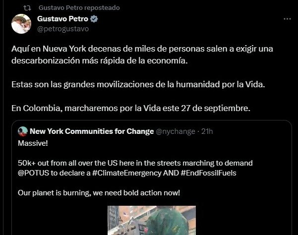 Durante la tarde del domingo 17 de septiembre, el presidente Gustavo Petro publicó en su cuenta de X un video de una manifestación en Nueva York, donde más de 50.000 personas se manifestaron contra el mandatario de Estados Unidos, Joe Biden, para declarar la emergencia climática y acabar con la dependencia de los combustibles fósiles.