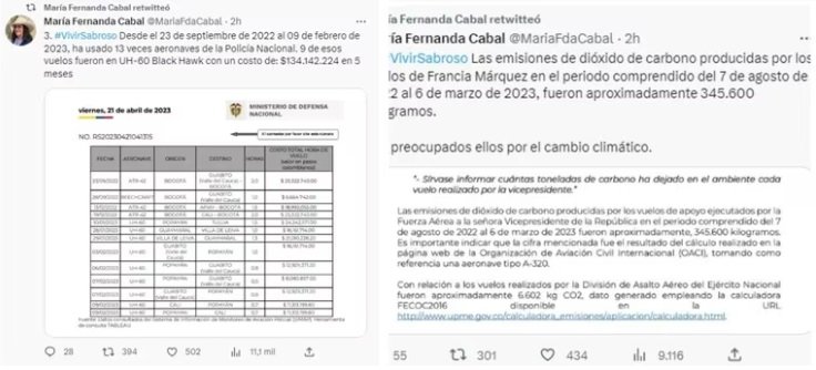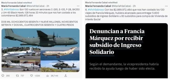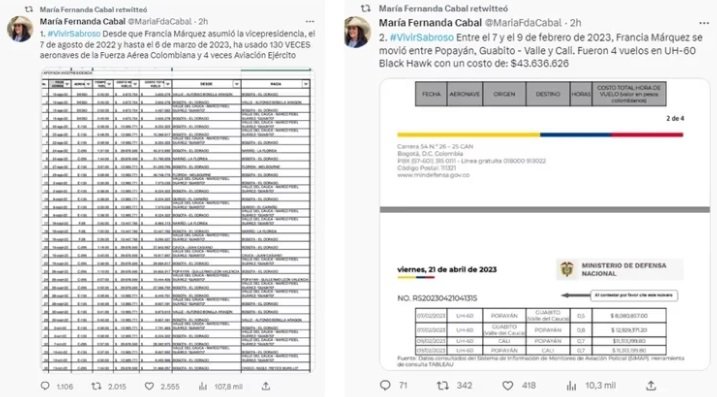 “Son 130 vuelos en aeronaves C-295, E-135, F-28, SK350 y UH-60 Black Hawk; 128 horas, 33 minutos que nos han costado a los colombianos $2.869.972.464 (…) Con los $2.869.972.464 que nos han costado los 130 viajes de Francia Márquez, hubiera alcanzado para entregar 5.600 subsidios de Ingreso Solidario u 83 subsidios para compra de Vivienda de Interés Social”, anotó en su cuenta oficial de Twitter María Fernanda Cabal.
