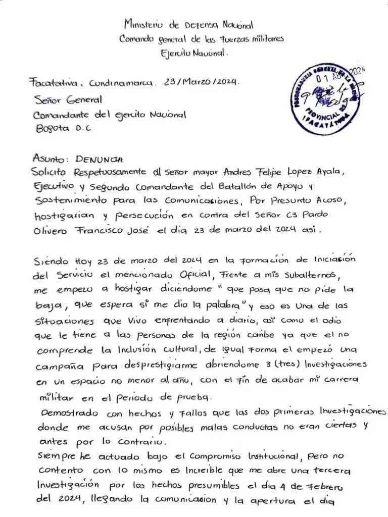 En una carta fechada el 23 de marzo de 2024 y dirigida al comandante del Ejército, Pardo Olivero detallaba las presuntas situaciones de hostigamiento y discriminación, incluidas las insistentes preguntas sobre una eventual baja y comentarios discriminatorios hacia los caribeños. Incluso, el fallecido joven aseguró que el mayor López había iniciado tres investigaciones en su contra con el objetivo de desprestigiar su carrera militar, las cuales consideraba infundadas.