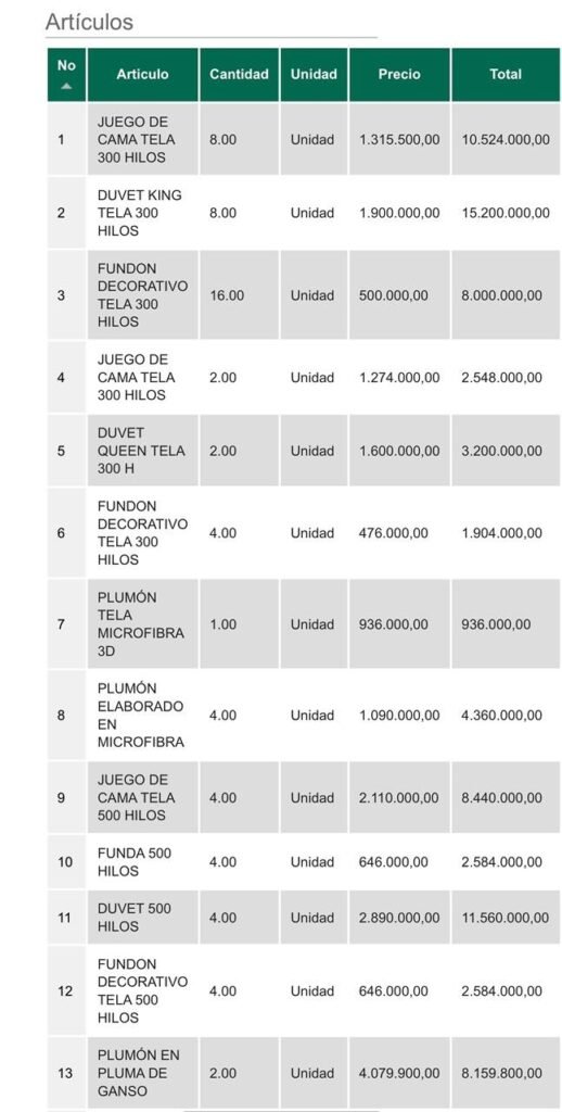 El gasto desmedido en el gobierno que indica una austeridad no acaba ahí, dado que también se registra otra sería de compras para la Casa de Huéspedes Ilustres de la Presidencia en Cartagena, aquí se registran compras de dos plumones de ganso por 8.159.800 pesos, cuatro Duvet de 500 hilos por 11.560.000 pesos entre otros lujosos artículos de lencería de hogar.