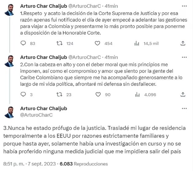 A través de su perfil, @ArturoCharC, el exsenador, además de recalcar su deseo de acatar la decisión de la Corte Suprema de Justicia, expresó que —apenas conoció de la orden de captura internacional, a través de circular roja de Interpol— empezó a adelantar las gestiones respectivas para llegar al país y ponerse a disposición de la Corte.