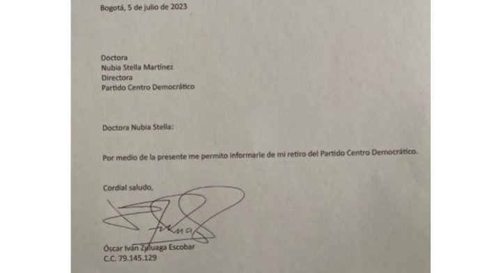 «Por medio de la presente me permito informarle de mi retiro del Partido Centro Democrático», dice la carta dirigida a la directora del partido, Nubia Stella Martínez.
