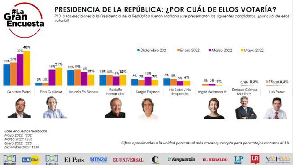 Aún así Hernández ha logrado escalar y mantenerse entre los candidatos con más opciones de pelear la presidencia. Aunque en el primer lugar sigue permaneciendo el candidato del Pacto Histórico, Gustavo Petro con una intención de voto del 40% y le sigue el antioqueño del Equipo por Colombia, Federico Gutiérrez con el 21%.