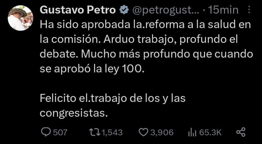 “Ha sido aprobada la reforma a la salud en la comisión. Arduo trabajo, profundo el debate. Mucho más profundo que cuando se aprobó la ley 100. Felicito el trabajo de los y las congresistas”, escribió el mandatario.