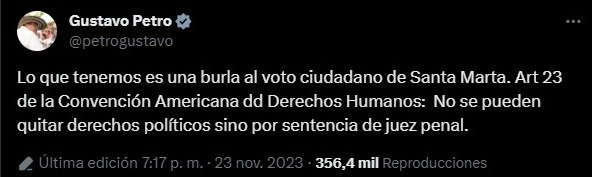 A través de su cuenta en X (antes Twitter), el mandatario escribió: “Lo que tenemos es una burla al voto ciudadano de Santa Marta. Art 23 de la Convención Americana dd Derechos Humanos: No se pueden quitar derechos políticos sino por sentencia de juez penal”.