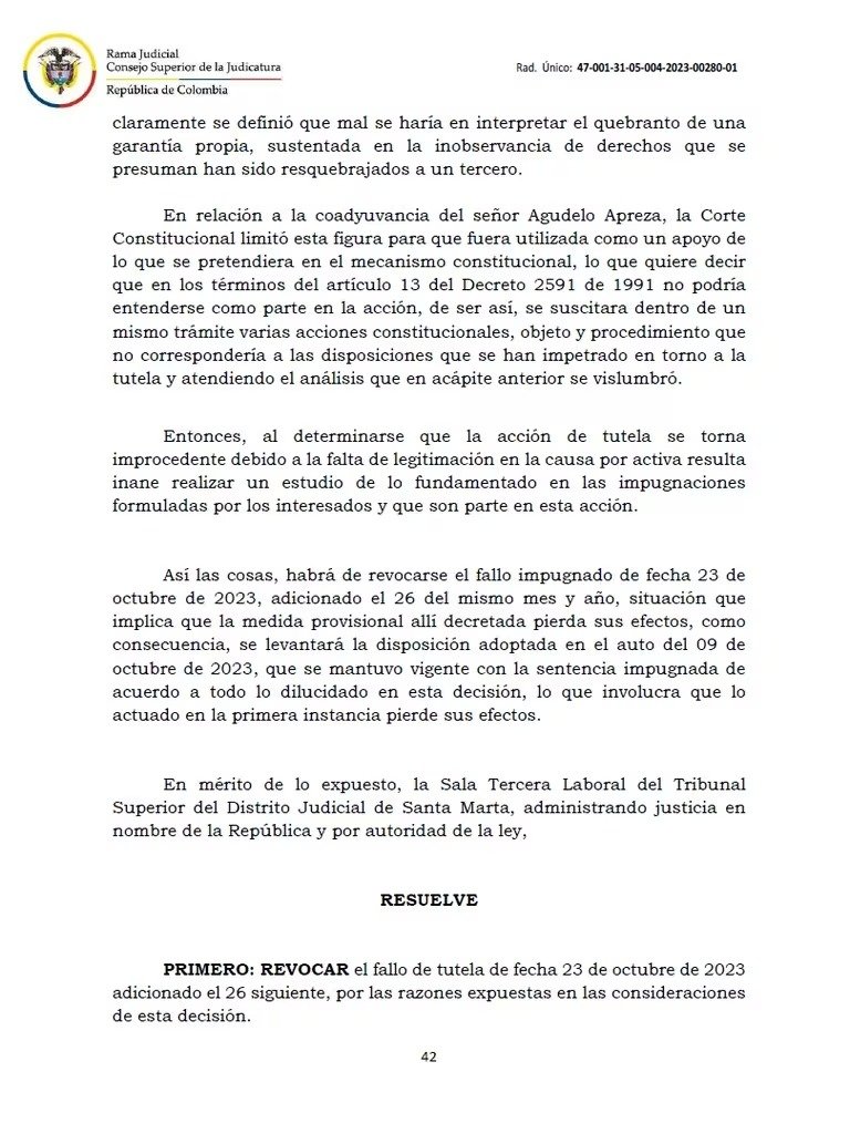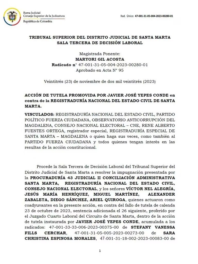 Tribunal Superior de Santa Marta revocó tutela que autorizó inscribir como candidato a Jorge Agudelo en remplazo de Patricia Caicedo, de Fuerza Ciudadana. El nuevo alcalde de la ciudad es Carlos Pinedo Cuello – crédito @Melquisedec70/X