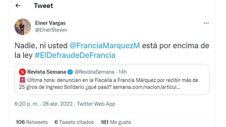 “Si la condición de pobreza o vulnerabilidad de la señora Francia Márquez cambió en el transcurso de los últimos años, esta tenía la obligación de haberlo reportado”, señaló en el documento Vargas. Además, en Twitter agregó un mensaje directo a Márquez, señalando que “nadie, ni usted, está por encima de la ley #ElDefraudeDeFrancia”.
