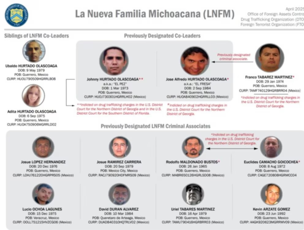 En febrero de 2025, el Departamento de Estado estadounidense designó a La Familia Michoacana como “Organización Terrorista Extranjera”. Entre los líderes sancionados por el gobierno estadounidense figuran los hermanos Johnny y José Alfredo Hurtado Olascoaga, junto a varios familiares involucrados en extorsión, narcotráfico y operación de redes logísticas, como el blanqueo de dinero a partir del comercio de ropa usada entre Estados Unidos y México.