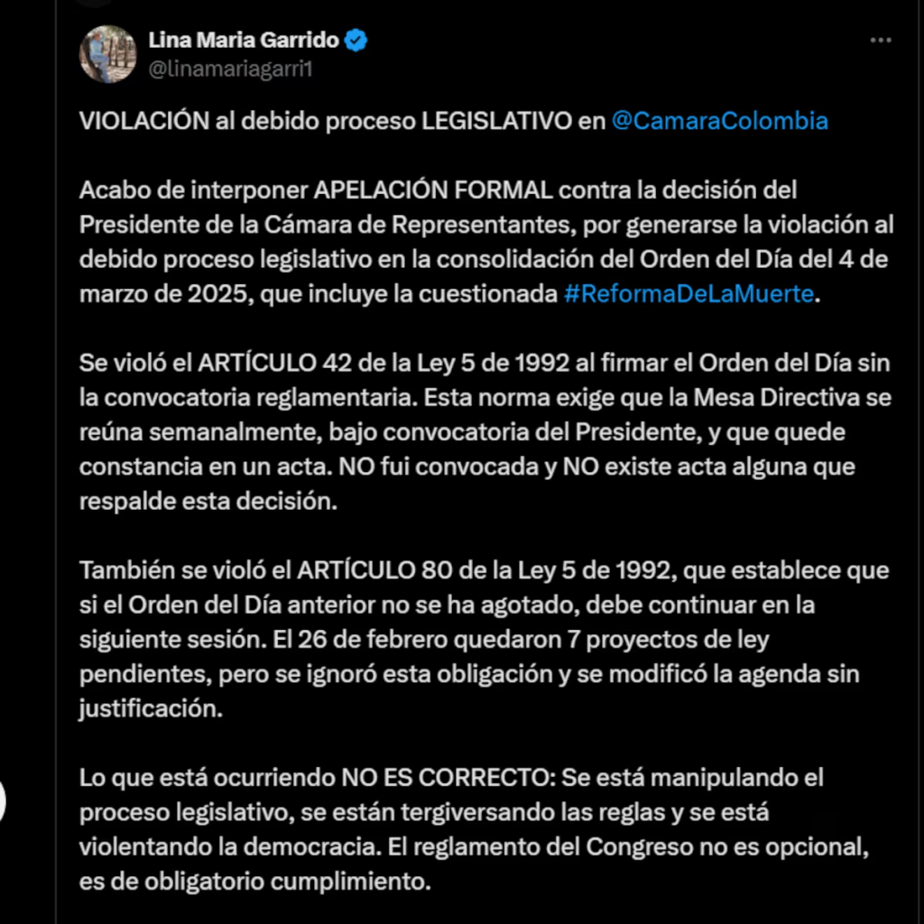 Se violó el artículo 42 de la Ley 5 de 1992 al firmar el orden del día sin la convocatoria reglamentaria. Esta norma exige que la mesa directiva se reúna semanalmente, bajo convocatoria del Presidente, y que quede constancia en un acta. No fui convocada y No existe acta alguna que respalde esta decisión”, aseguró Garrido.