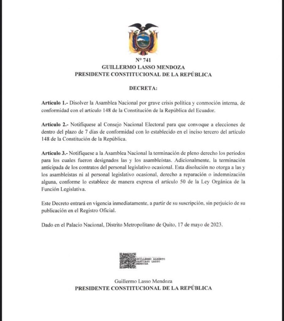 “He firmado el Decreto Ejecutivo 741, con el objetivo de disolver la Asamblea Nacional y solicitar al CNE se convoque a elecciones. Ecuatorianas y ecuatorianos: esta es la mejor decisión para darle una salida constitucional a la crisis política y conmoción interna que soporta el Ecuador y devolver al pueblo ecuatoriano el poder de decidir su futuro en las próximas elecciones”, anunció el jefe de Estado en alocución.