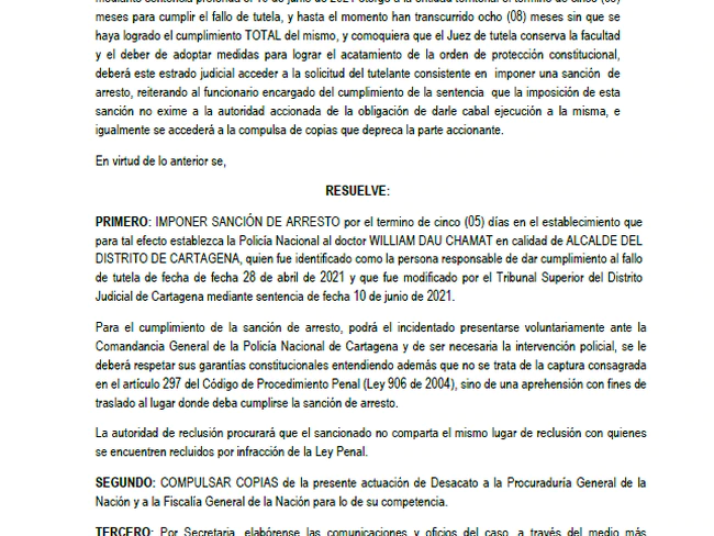 En su parte resolutiva del incidente de desacato, el despacho judicial señala que para el cumplimiento de la sanción de arresto, el mandatario puede presentarse voluntariamente “ante la Comandancia General de la Policía Nacional de Cartagena y de ser necesaria la intervención policial, se le deberá respetar sus garantías constitucionales entendiendo además que no se trata de la captura consagrada en el artículo 297 del Código de Procedimiento Penal (Ley 906 de 2004), sino de una aprehensión con fines de traslado al lugar donde deba cumplirse la sanción de arresto”.