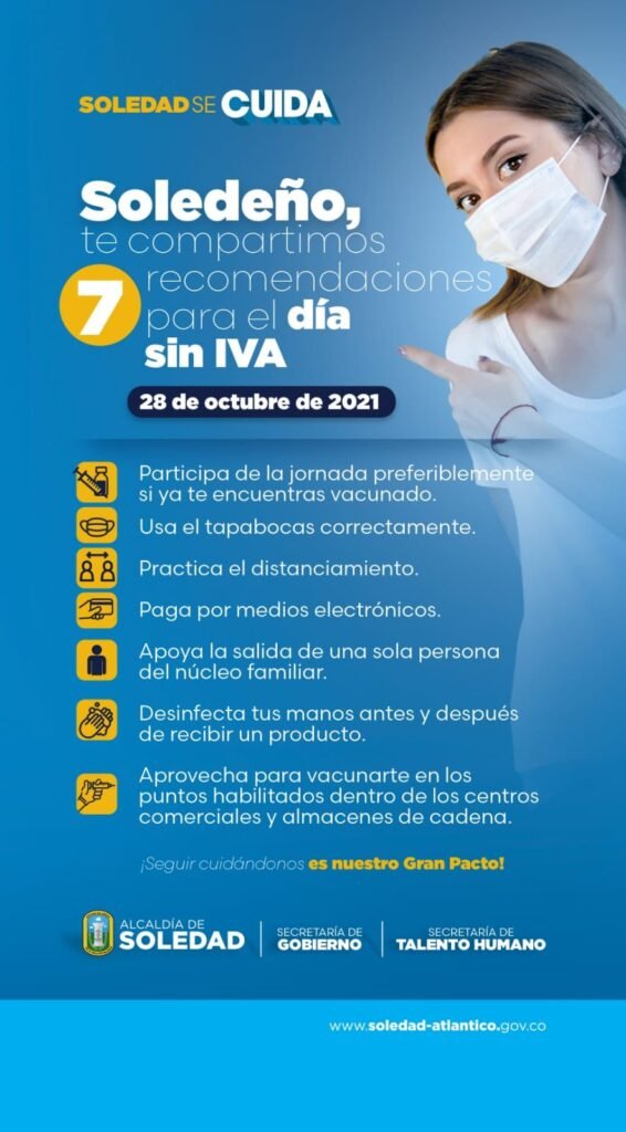El secretario de Salud, Manuel Navarro, explicó, por su parte, que, en los centros comerciales y almacenes de cadena de mayor concurrencia en el municipio, estarán disponibles unos puntos de vacunación para que, durante el día sin IVA, las personas que acudan a adquirir sus productos, se apliquen la dosis correspondiente contra el Covid-19. «Hacemos un llamado a la comunidad, es necesario contar con su participación. Vacunarnos es la única forma de estar tranquilos y lograr la reactivación en nuestro ente territorial”, enfatizó el secretario.